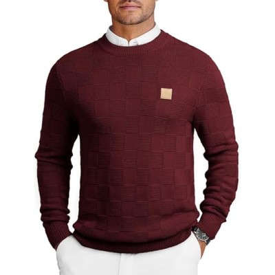 Mens Sweater Crewneck Checkered Knitted Pullover Slim Fit Long Sleeve Casual Sweater