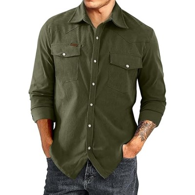 Men's Corduroy Shirts Casual Western Long Sleeve Button Down Shacket Jackets with 2 Flap Pocket