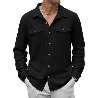 Men's Long Sleeve Button Down Linen Shirt Casual Solid Untucked Roll-Up Sleeve Beach Shirts Wedding Shirts with Pocket