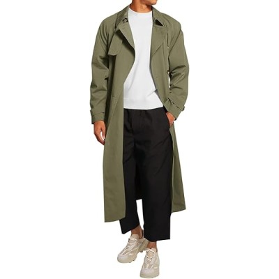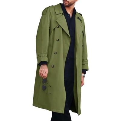 Mens Trench Coat Double Breasted Belted Windbreaker Jackets Lapel Lightweight Long Jacket Casual Overcoat